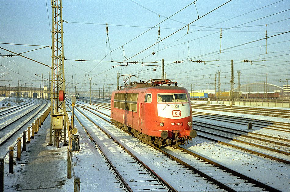 103 197 am 07.12.1990 an der Bw-Einfahrt München Hbf