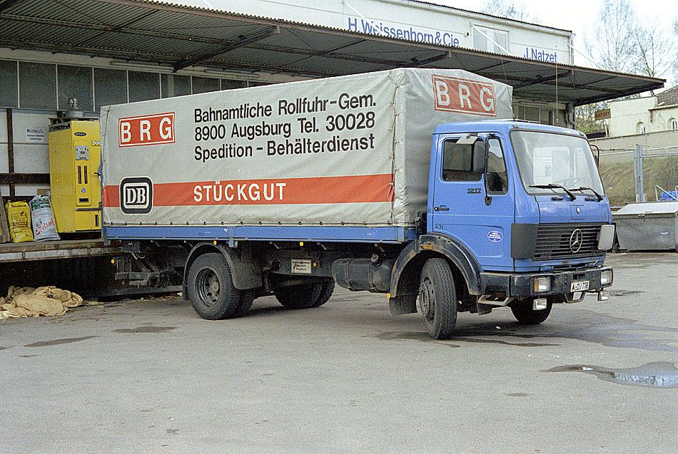 Mercedes 1217 der Bahnamtlichen Rollfuhr Gem. (BRG) Augsburg in den Achtzigern in Augsburg.