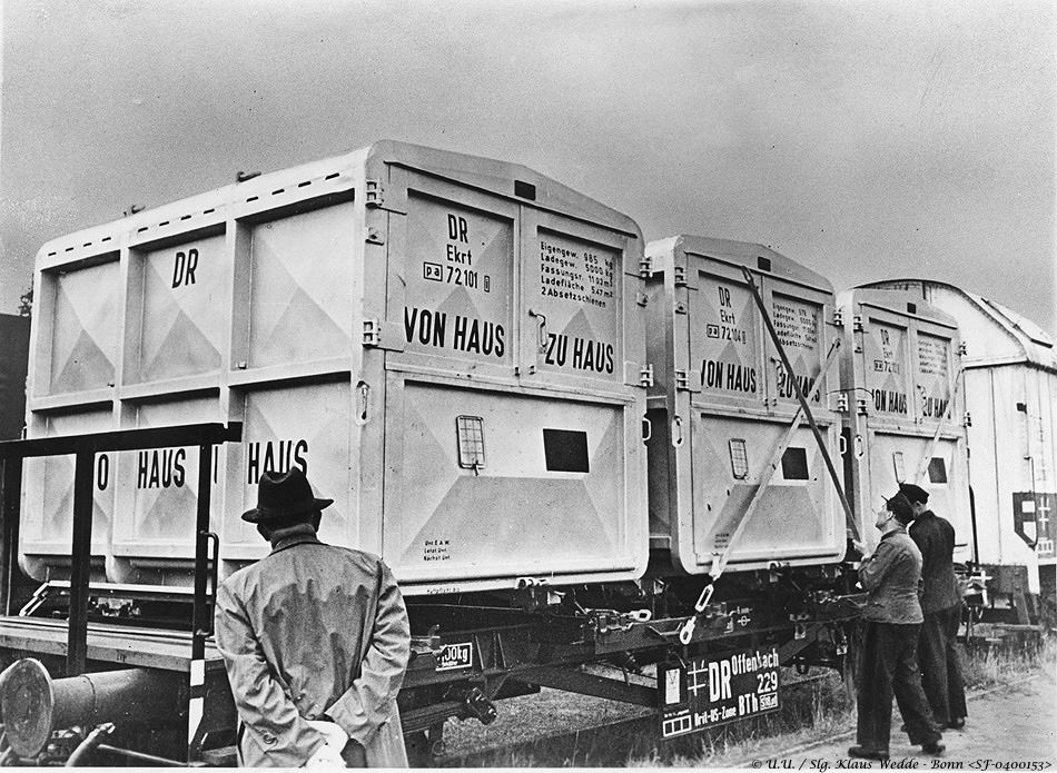Die Bundesbahn schaffte für Industrie und Handel 1950 wieder eine zweckmäßige Neuerung. Der Großbehälter „Von Haus zu Haus“ fasste 5 Tonnen und konnte für empfindliche Güter geschlossen oder als offener Behälter verwendet werden. Die Ladegüter wurden nicht mehr ein- und ausgepackt, sondern kamen auf dem sichersten Wege vom Produzenten direkt an den Verbraucher oder Großhändler. Interessant war noch, dass die Bundesbahn für dieses Verfahren keinerlei Sondergebühren erhob, sondern lediglich bei der Zugrundelegung des Transportpreises die allgemeinen Bestimmungen über das Gewicht von Frachtstücken zugrunde legte.
