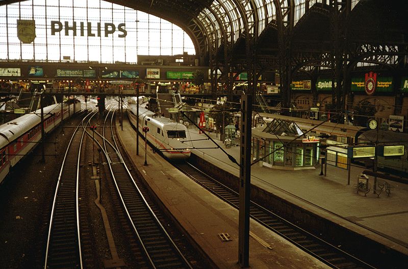 Die Halle des Hamburger Hauptbahnhofs mit 401 064 am 19.02.1997