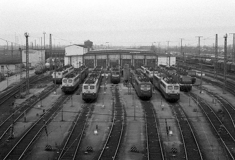 Blick von der Brücke auf das Bahnbetriebswerk Mannheim am 08.12.1991