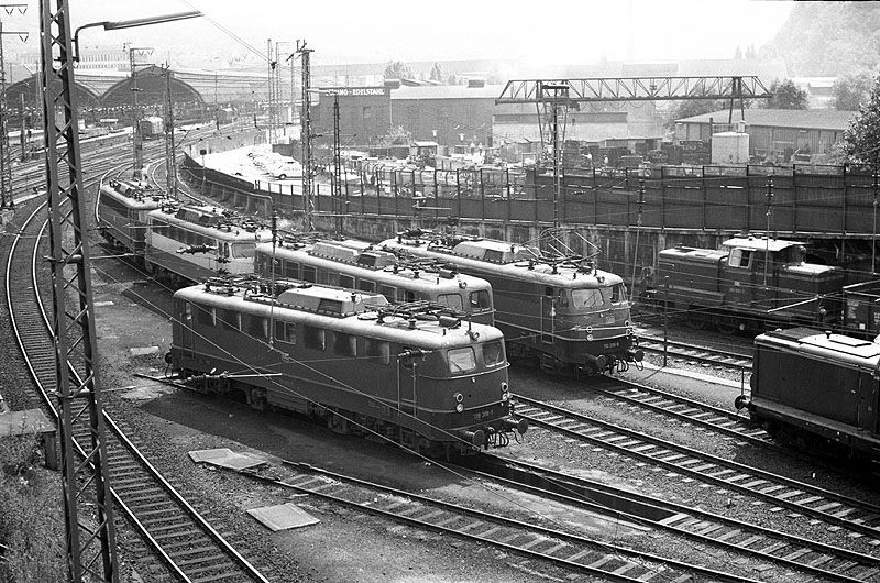 Abgestellte Lokomotiven im Bahnbetriebswerk Hagen-Eckesey im Juni 1974. Im Vordergrund steht 139 309.