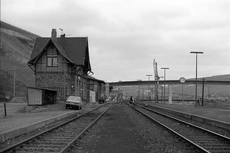 Blick auf den Bahnhof Heimersheim am 03.03.1979. Noch ist links das Abstellgleis vorhanden.