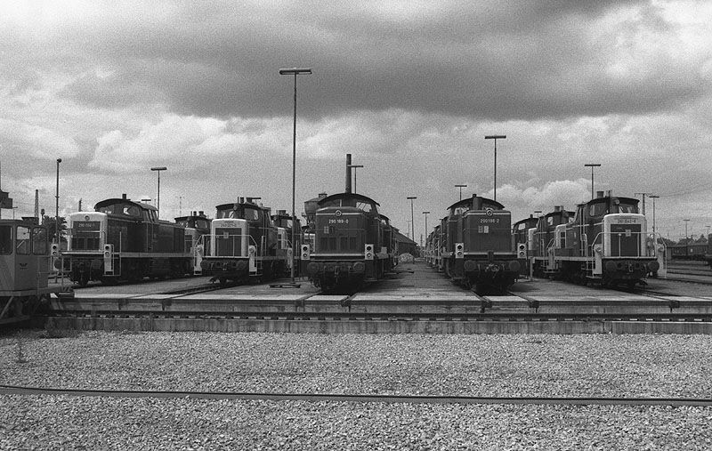 Abgestellte Diesellokomotiven der Baureihen 260, 261 und 290 im Bahnbetriebswerk Mannheim 1 am 27.06.1982