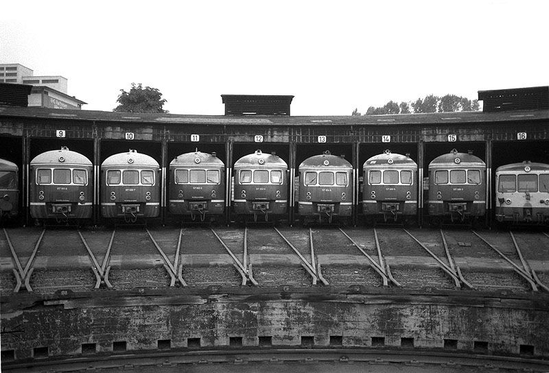 Parade von Akkumulator-Triebwagen im Bahnbetriebswerk Limburg am 02.10.1983