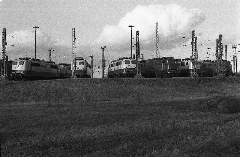 Wochenendruhe für E-Loks im Bahnbetriebswerk Bremen 4 am 05.02.1984