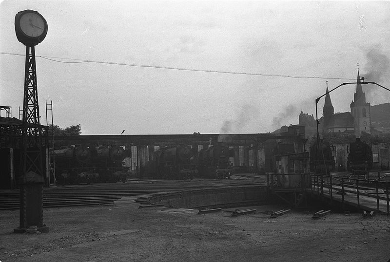 Bahnbetriebswerk Bingerbrück am 19.08.1967 mit Dampflokomotiven der Baureihen 23 und 50.