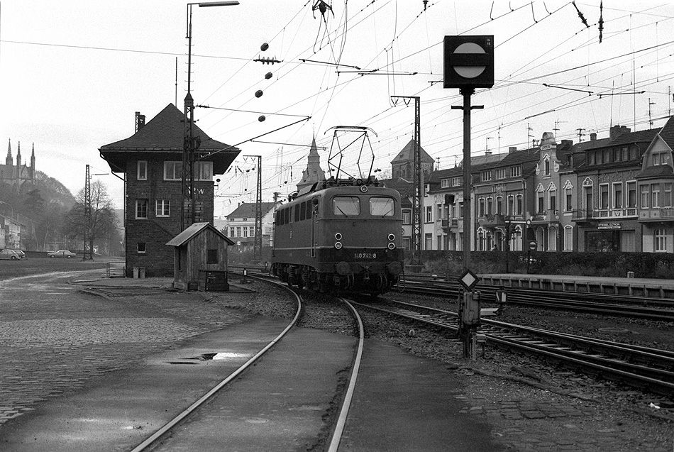 Schutzhaus der Güterwaage am Stellwerk West im Bahnhof Remagen am 05.01.1980, mit vorbeifahrender 140 742