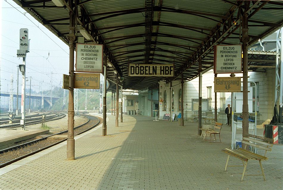 Beschilderung Bahnsteig 1 und 2 in Döbeln Hbf am 21.09.1992