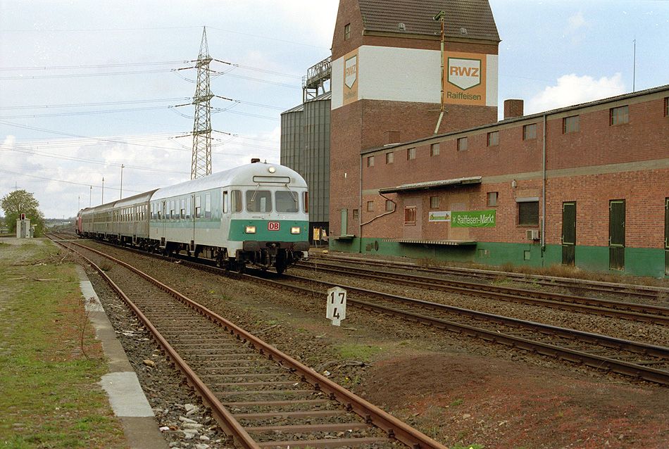 Blick auf einfahrenden Zug aus Euskirchen in den Bahnhof Meckenheim am 10.04.1994