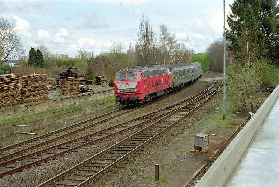 Blick auf den einfahrenden Zug mit 215 117 aus Bonn in den Bahnhof Meckenheim am 10.04.1994