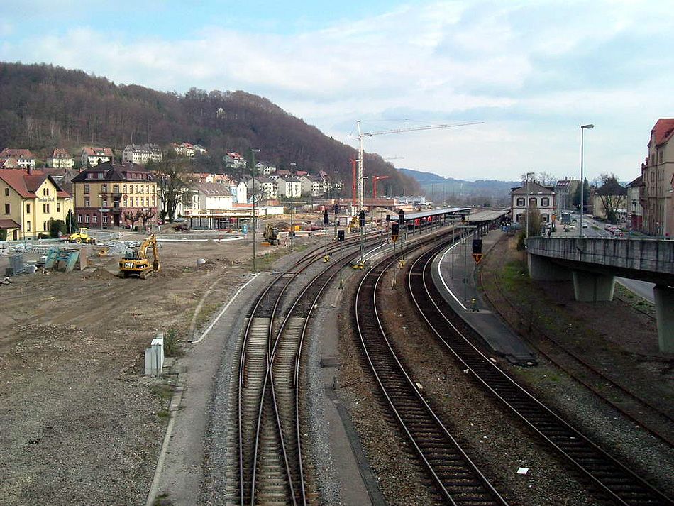 Blick auf den Bahnhof Waldshut mit allen Gleisen von der nahen Straßenbrücke im Jahre 2007,