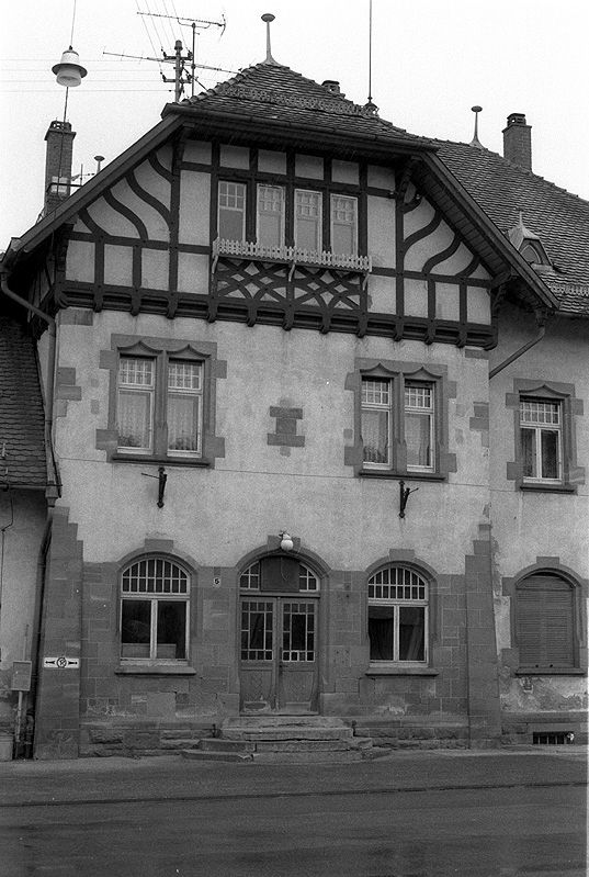 Blick auf die Straßenseite des Bahnhofs Bonndorf mit Eingangstür am 26.06.1985, vor der Instandsetzung.