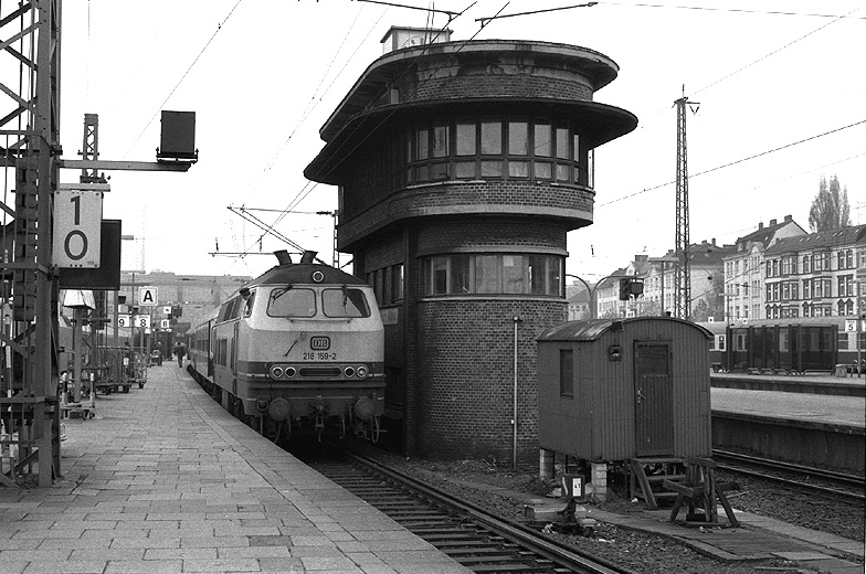 In Hamburg-Altona steht 218 159 mit einem D-Zug nach Belin-Stadtbahn am 07.11.1989 zur Abfahrt bereit