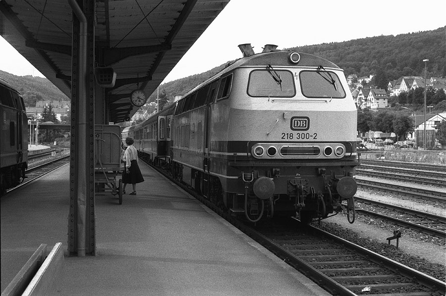 218 300 bringt am 20.07.1987 ihren Zug von Waldshut nach Erzingen