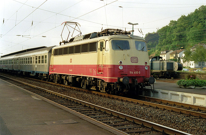 114 493 mit einem Nahverkehrszug am 11.06.1992 im Bahnhof Remagen