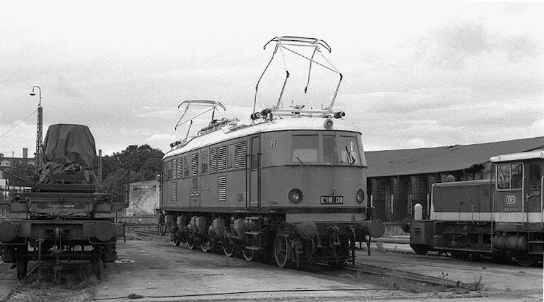 E18 08 im Bw München Hbf am 27.08.1989. Zur Fortbewegung fehlt nur noch die Oberleitung !
