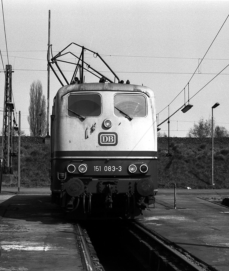 151 083 vom Bw Hagen-Eckesey mit defektem Stromabnehmer am 07.04.80 im Bw Gremberg
