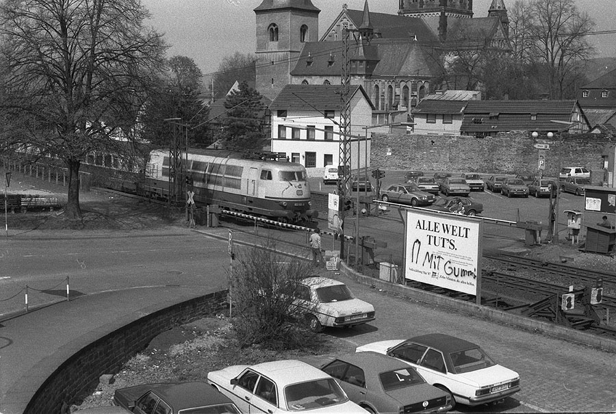 103 122 durchfährt mit ihrem IC am 23.04.1987 Remagen