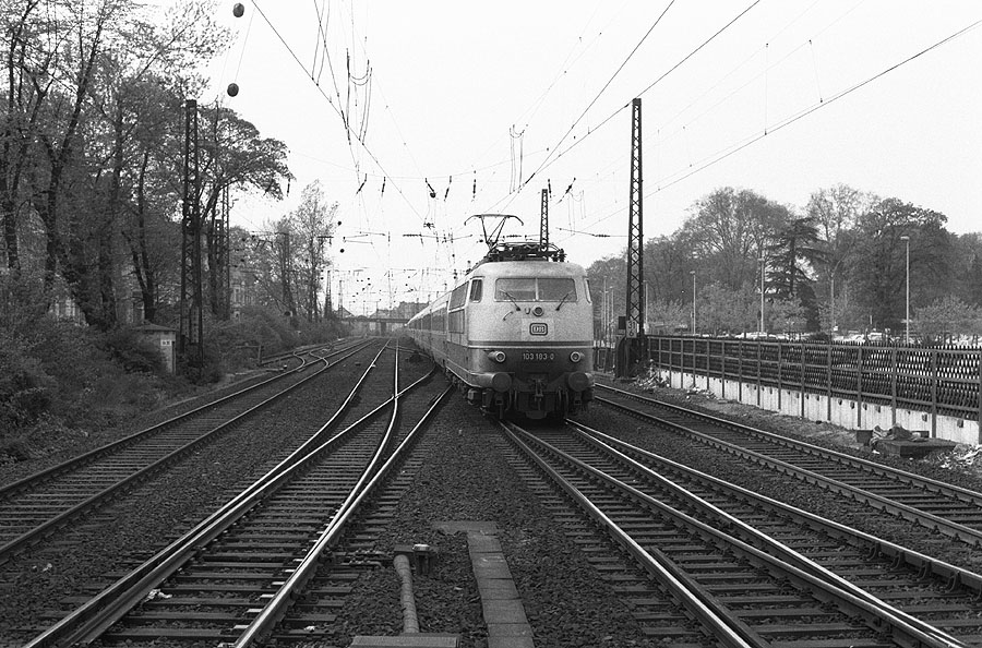Auf Gleis 2 des Bonner Hbf fährt am 29.04.1987 103 183 mit ihrem IC ein