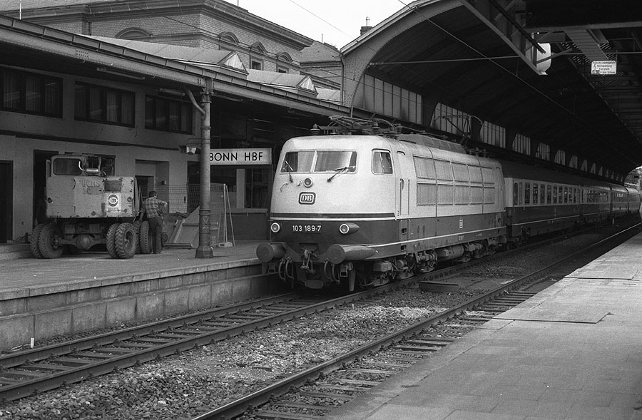 103 189 steht am 14.07.1988 mit ihrem TEE an Gleis 1 des Bonner Hbf