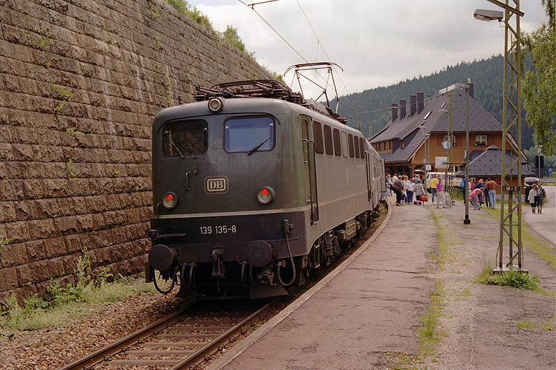 139 135 am 11.07.1990 kurz nach der Ankunft in Seebrugg mit Nahverkehrszug aus Richtung Titisee