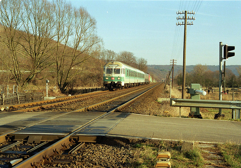 Ein Nahverkehrswendezug, geschoben von 212 255 am 17.01.1993 bei Lohrsdorf/Ahr