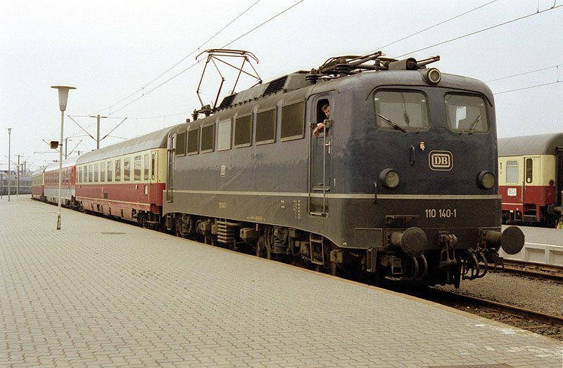 110 140 mit einem Messe-Sonderzug in Hannover-Messebahnhof am 21.03.1990