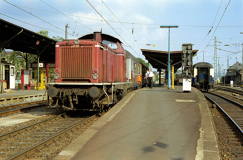 213 337 in Remagen am 17.05.1990 mit dem Nahverkehrszug um 17.25 Uhr nach Ahrweiler