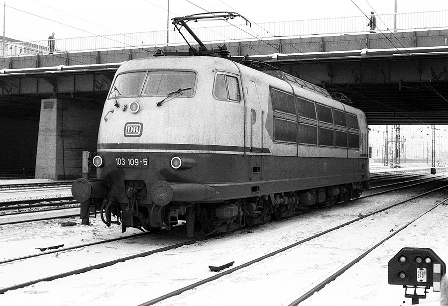 Auf dem Weg ins Bw München Hbf zeigt sich 103 109 am 22.01.1987 an der Donnersberger Brücke