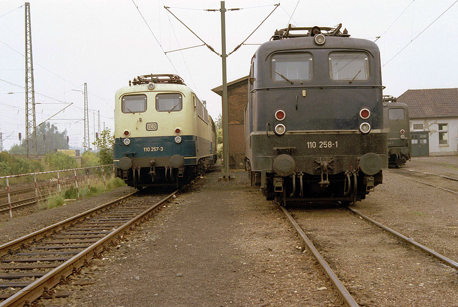 110 257 und 110 258 pausieren am 11.09.1988 im Bw Bielefeld