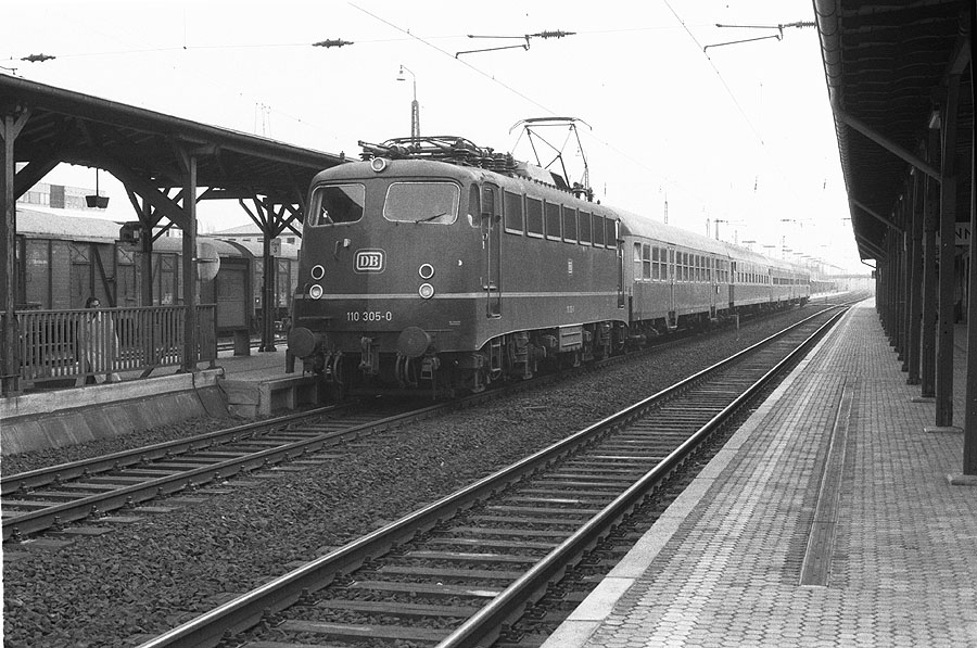 Am 09.04.1987 verlässt 110 305 mit ihrem Zug Bonn-Beuel in Richtung Köln