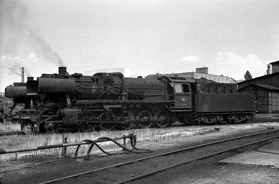 Im Bw Frankfurt Main 2 bläst am 04.08.1967 der "Rückenwind" den Rauch der 50 3009 nach vorn weg