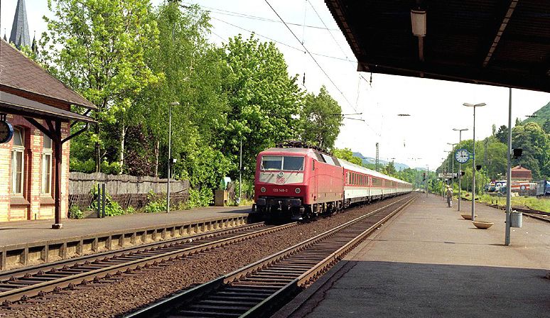 120 148 mit einem Inter City am 21.05.1995 in Bad Breisig.