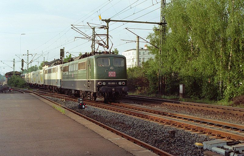 151 055 und 150 130 mit einem Bananenzug in Bonn-Beuel am 18.05.1996 in Richtung Köln.