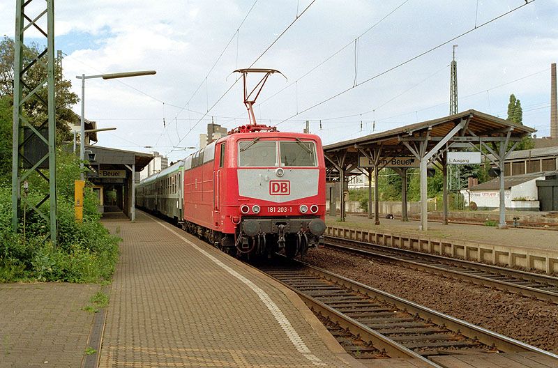 181 203 steht am 24.08.1996 mit dem D 1273 nach Port Bou in Bonn-Beuel zur Abfahrt bereit.