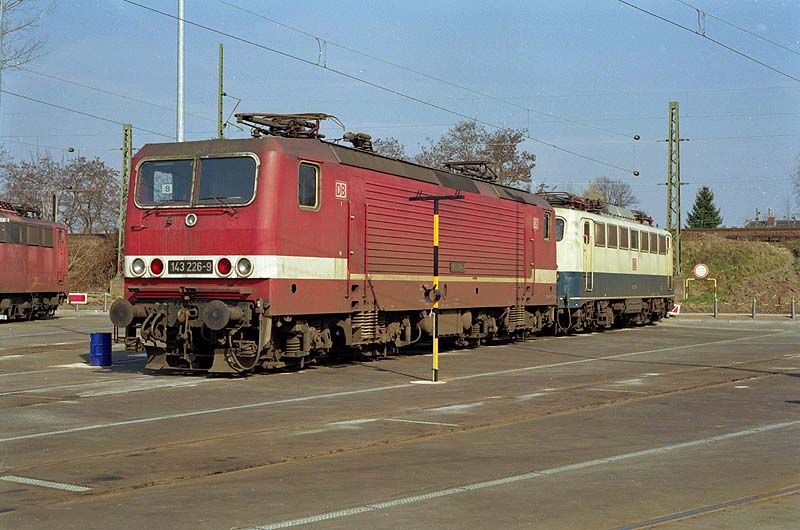 143 226 und eine Lok der BR 150 im Bw Gremberg am 08.03.1997.