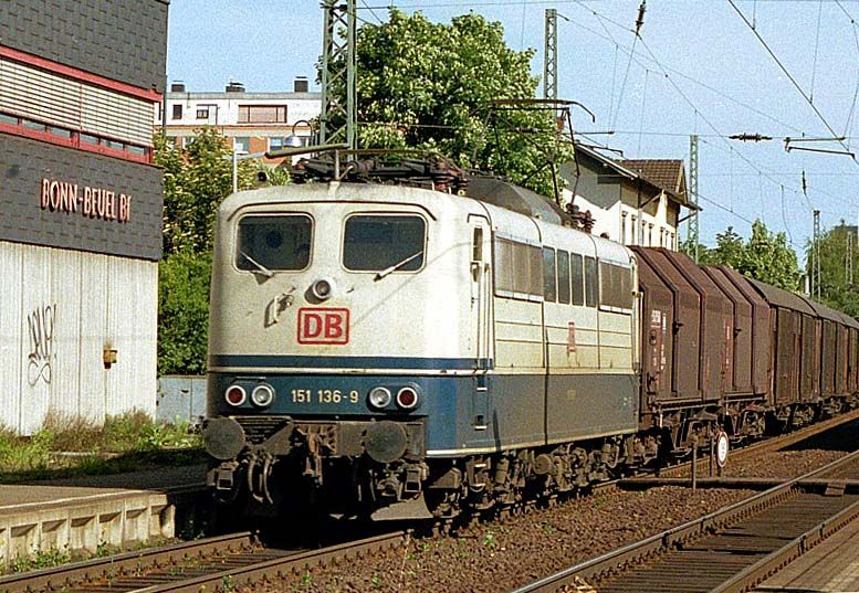 151 136 mit einem Güterzug am 31.05.1997 in Bonn-Beuel.