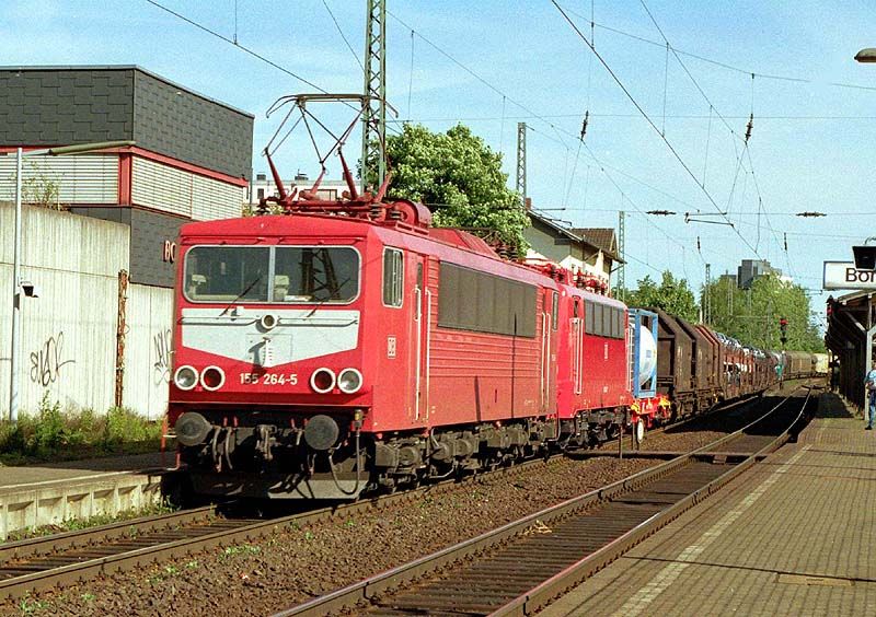 155 264 zieht am 31.05.1997 einen Güterzug und eine abgebügelte BR 141 durch Bonn-Beuel.