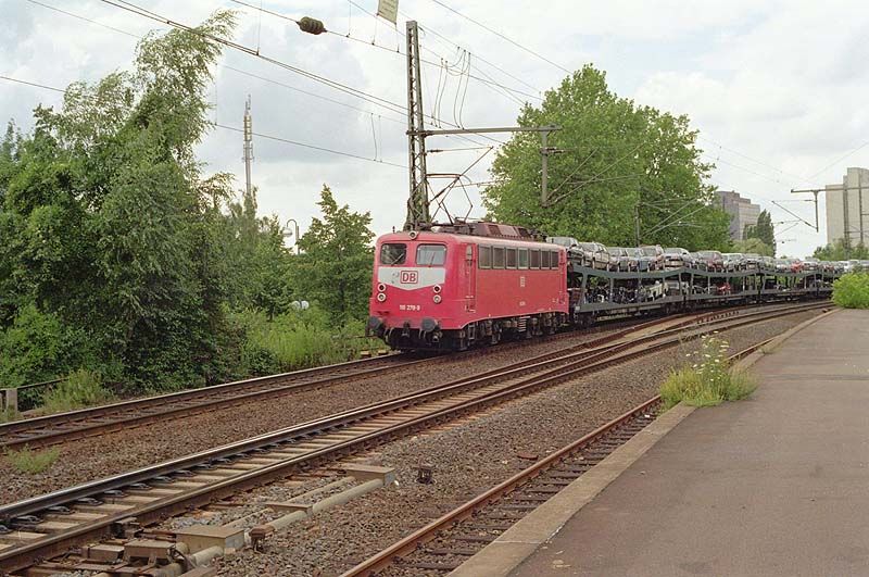 Mit einem Zusatzzug zu einem regulären Autoreisezug durchfährt 110 278 am 10.07.1995 Bonn-Beuel.
