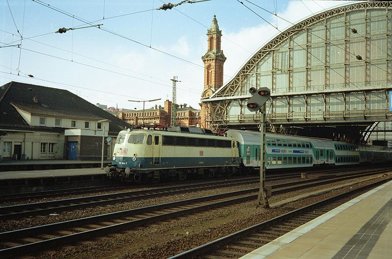 110 364 vor einem Regional-Express in Bremen Hbf. am 19.02.1997.