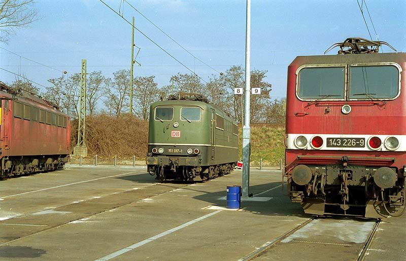Eine unbekannte BR 150, 151 017 und 143 226 im Bw Gremberg am 08.03.1997.