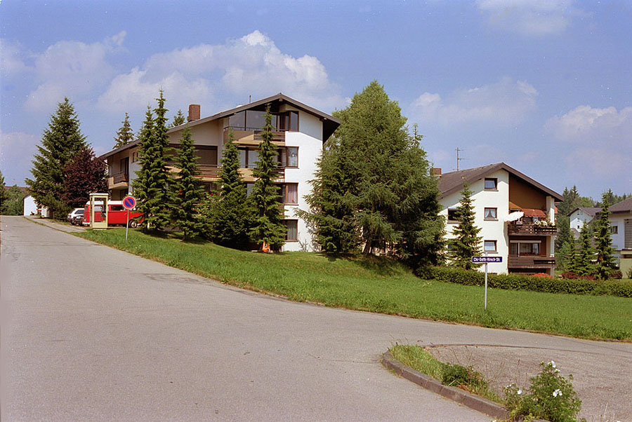 Die auf der Wiese stehenden und von Bäumen umringten Häuser stehen in der Straße "Im Grün".