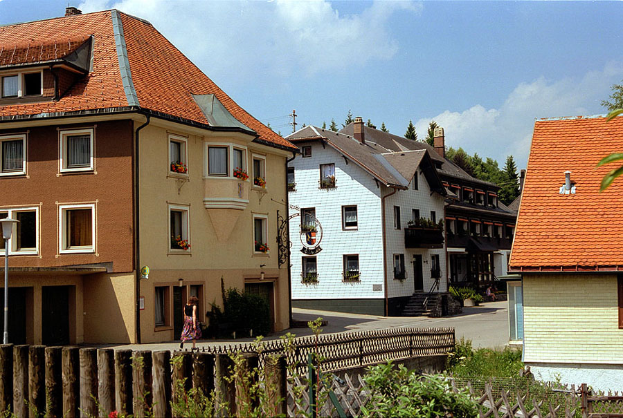 Vom Garten des gegenüberliegenden Hauses kann man die schöne Fassade des Rathauses bewundern.