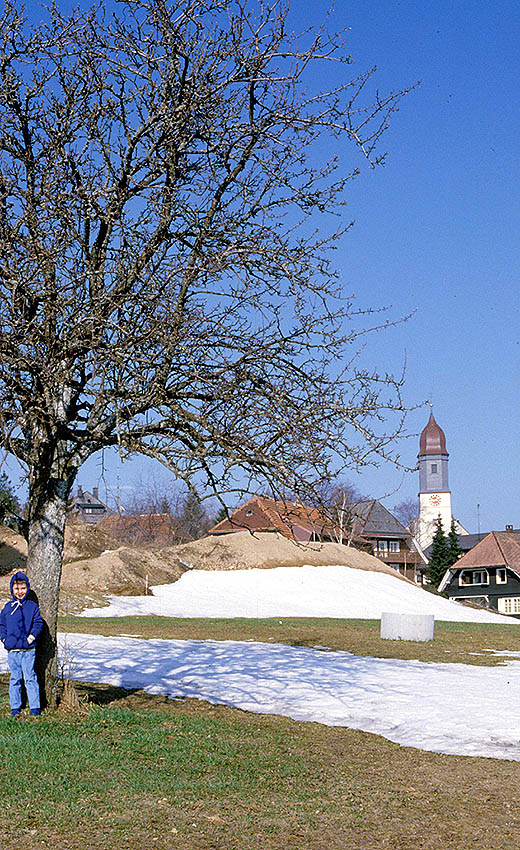 Unter einem Baum im Hebelweg hat sich mein Sohn Thomas 1984 neben den Turm von St. Michael gestellt.