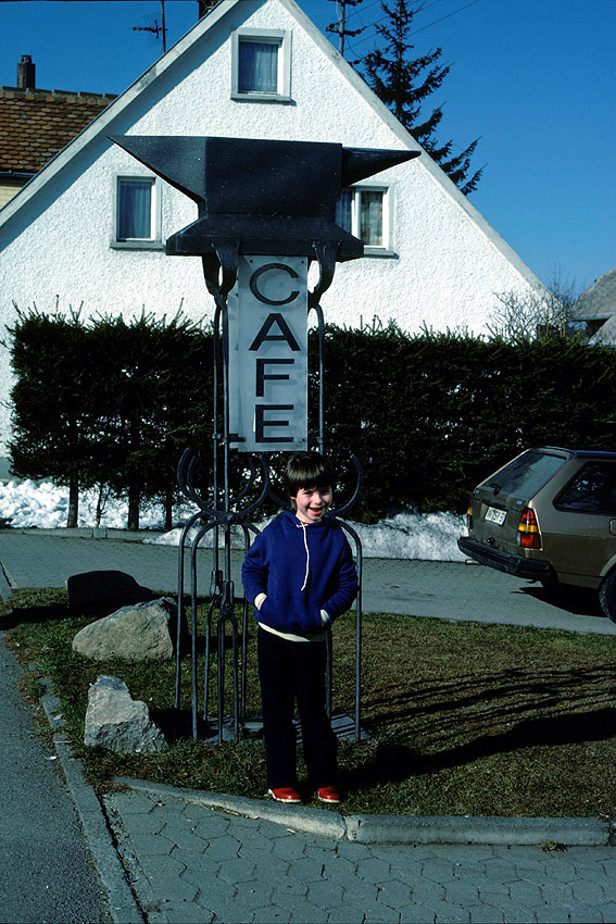 Hoffentlich kippt der Amboss der Dorfschmiede nicht um, sagt mein - mutig darunter stehender - Sohn Thomas.