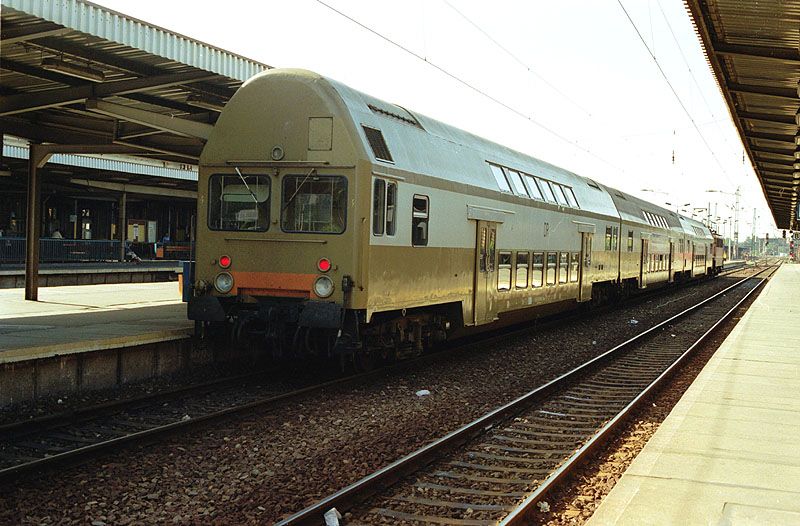 Doppelstockgarnitur mit Steuerwagen Typ DBmq und zwei Mittelwagen Typ DBmu am 26.06.1992 in Magdeburg Hbf.
