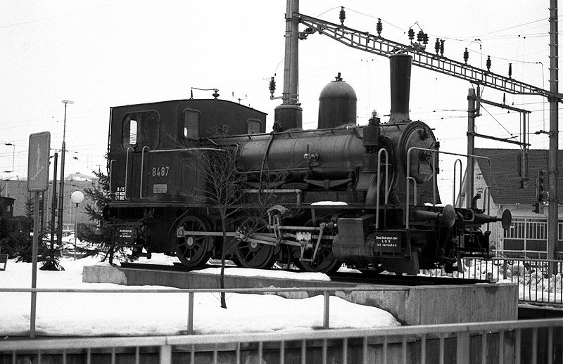 Dampflok E 3/3 8487 am 08.02.1981 als Denkmal in Buchs / Schweiz