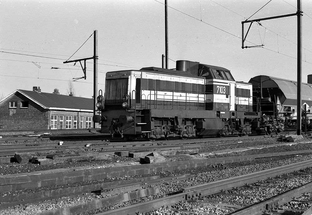 Eine von drei Dieselloks ist die 7103, hier im September 1985 in Antwerpen-Hafenbahnhof / Belgien