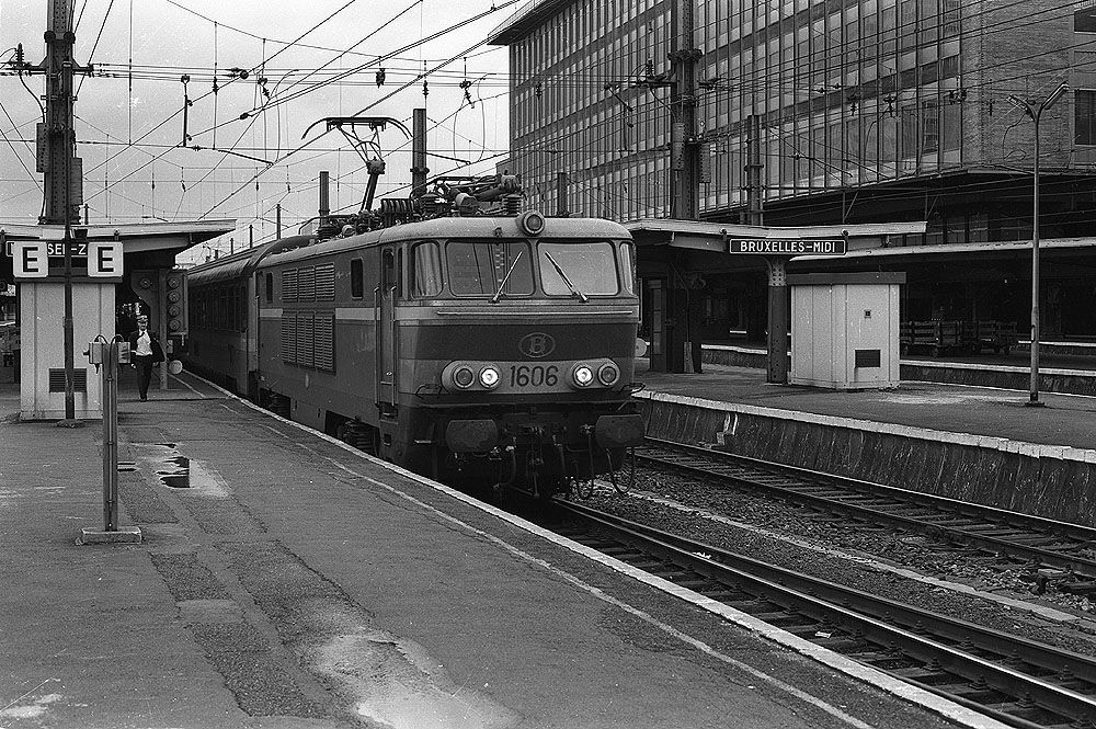 Elektrolok 1606 ist mit einem Reisezug im Juli 1985 in Brüssel-Midi / Belgien eingelaufen